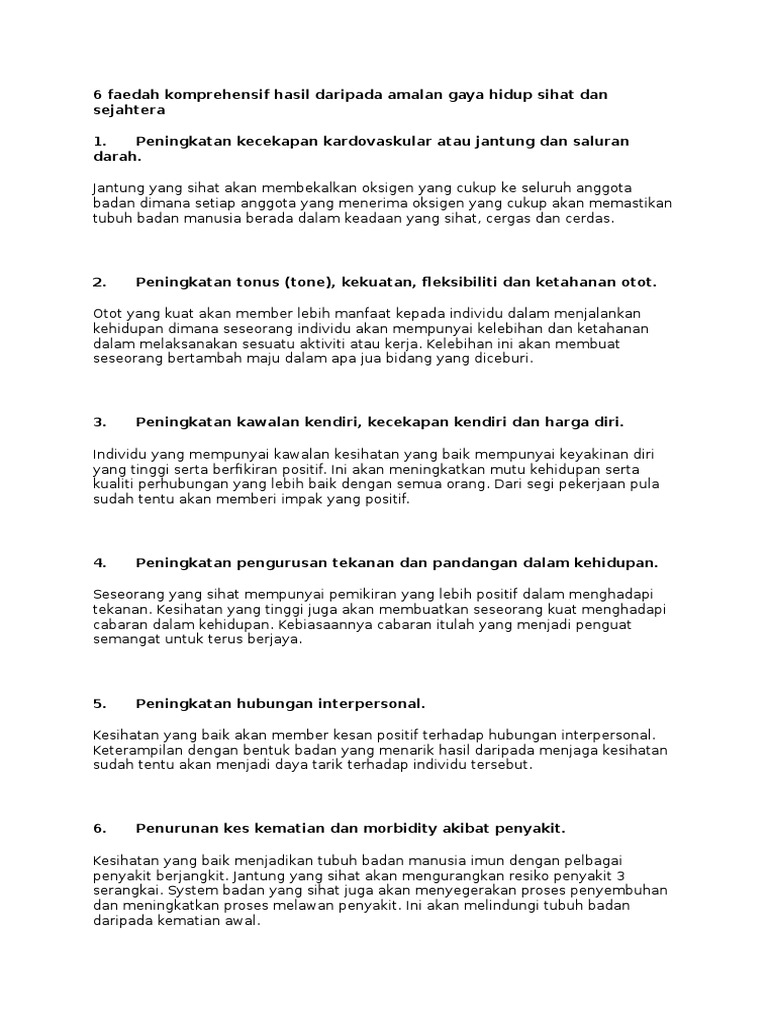 6 Faedah Komprehensif Hasil Daripada Amalan Gaya Hidup Sihat Dan Sejahtera from imgv2-1-f.scribdassets.com Contoh, masyarakat ingin mengetahui dengan lebih lanjut berkaitan gaya hidup sihat. Oleh itu, mereka boleh melayari internet dan mencari maklumat tentang gaya hidup sihat bagi membantunya mengamalkan gaya hidup sihat tersebut. Selain itu, mereka juga boleh mencari Penanda wacana ini digunakan bagi mengindahkan gaya bahasa dalam penulisan insyak serta membantu menambahkan jumlah perkataan agar menepati kehendak soalan.